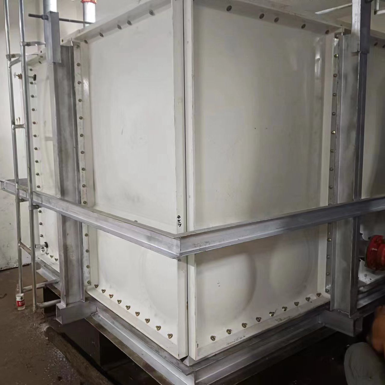 由于使用環境及使用介質所限,有些水箱內部盛有高濃度溶液,如:濃鹽水、海水等,對水箱內壁鋼板會有嚴重腐蝕,因此無法采用不銹鋼水箱或者鋼板水箱。正常玻璃鋼水箱板可以耐腐蝕,但是水箱內部又設有鋼制拉筋支撐等,故此也不適用以上介質使用。為了滿足特殊用戶的使用需求,經過承重及承壓測試后,這種無內件玻璃鋼水箱面世,它采用不同規格(1000*1000mm、1000*500mm、500*500mm)的玻璃鋼模壓板組裝,水箱內部不設有任何鋼制配件,水箱外部及底部采用工字鋼加固,所有法蘭采用ABS材質俗稱塑料材質,外觀整潔無變形,內部無配件,易清洗、維護方便,延長了水箱的使用壽命,滿足特殊用戶的特殊需求。