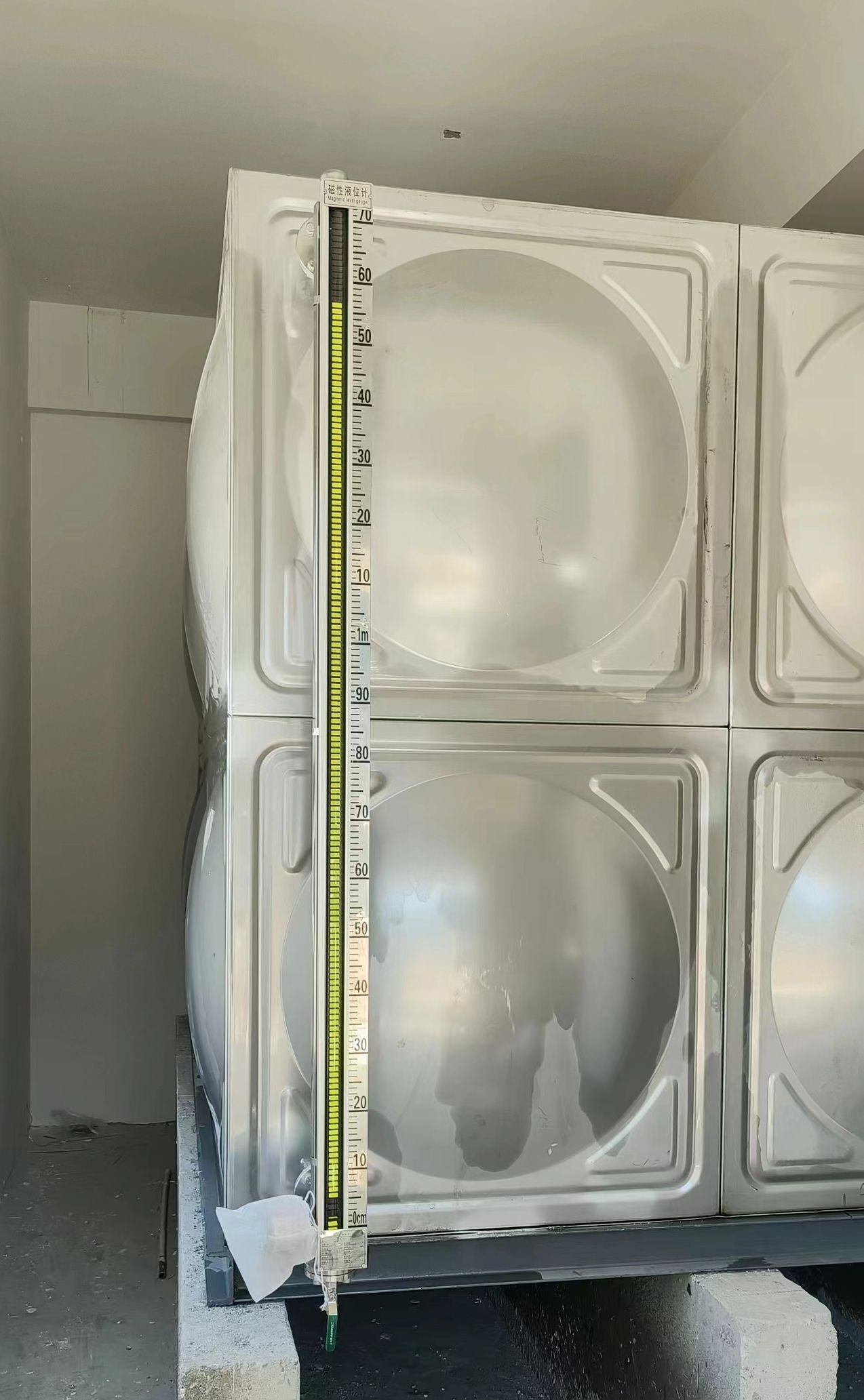 液位計根據浮力原理,浮子在測量管內隨液位的升降而上下移動,浮子內的長久磁鋼通過磁耦合作用,驅動紅、白色翻柱翻轉180’液位上升時,翻柱由白色轉為紅色,下降時,翻柱由紅色轉為白色,從而實現液位的指示。