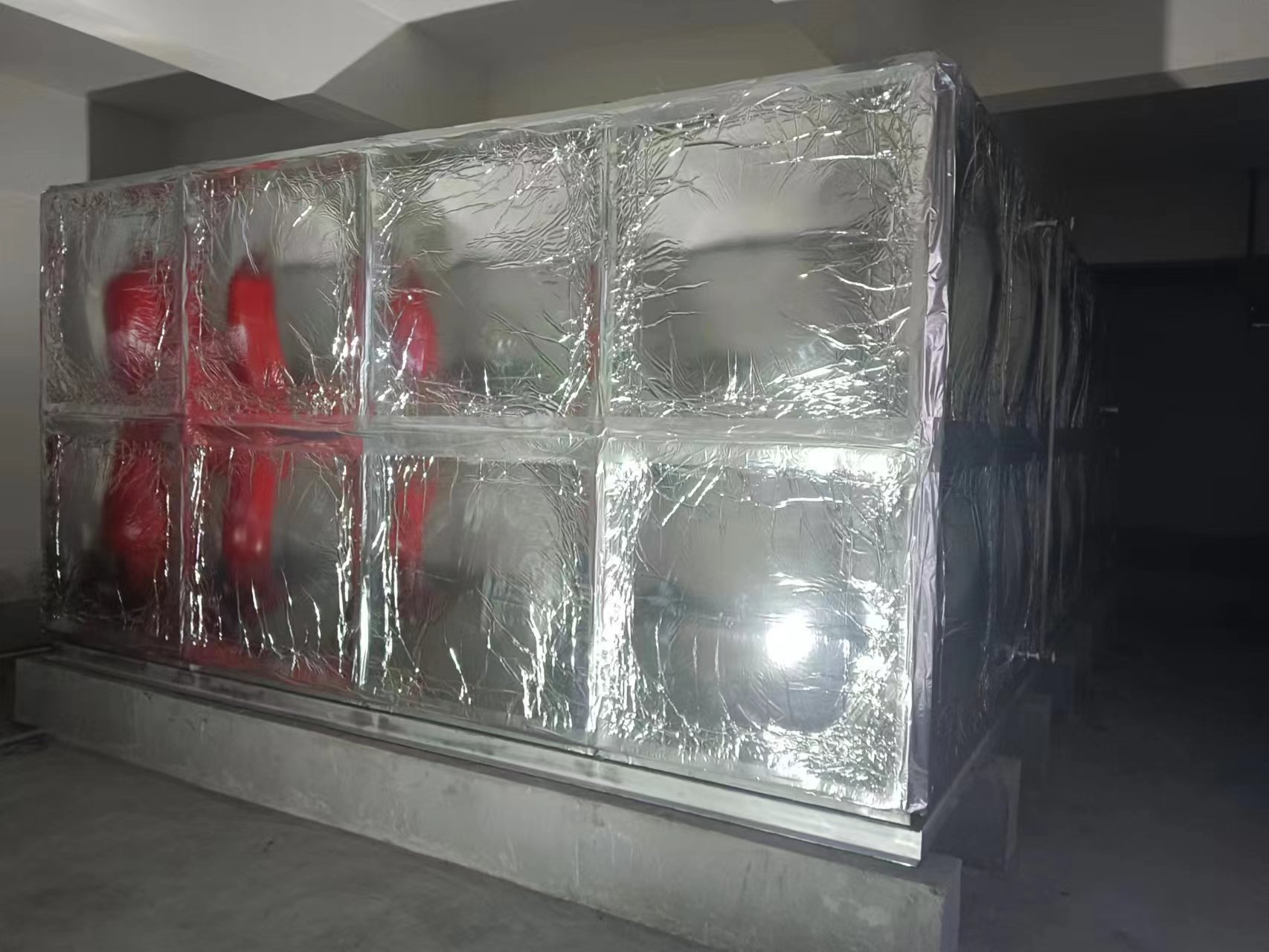 我廠承接的山東省濰坊市泰和東郡項目裝配式304不銹鋼保溫水箱已經安裝試水完成。此水箱為螺絲組裝并加有橡塑鋁箔布保溫,此保溫的特點為在橡塑基體層表面粘合連接鋁箔層,經過特殊處理使其成為一體,再加上鋁箔層本身的特征,大大加強了橡塑材料的各種性能指標。通過抗老化實驗,其使用年限可達30年以上,而起復合鋁箔層后可進一步降低材料的導熱系數,增強其防結露性能,同時還能提高其抗壓強度幾十倍。此外由于鋁箔層為銀白色,增強了其外觀裝飾效果。該材料在使用中不會危害健康,能防止霉菌生長,避免害蟲或老鼠咬嚙,耐酸抗堿,是保溫材料中的理想絕熱材料。