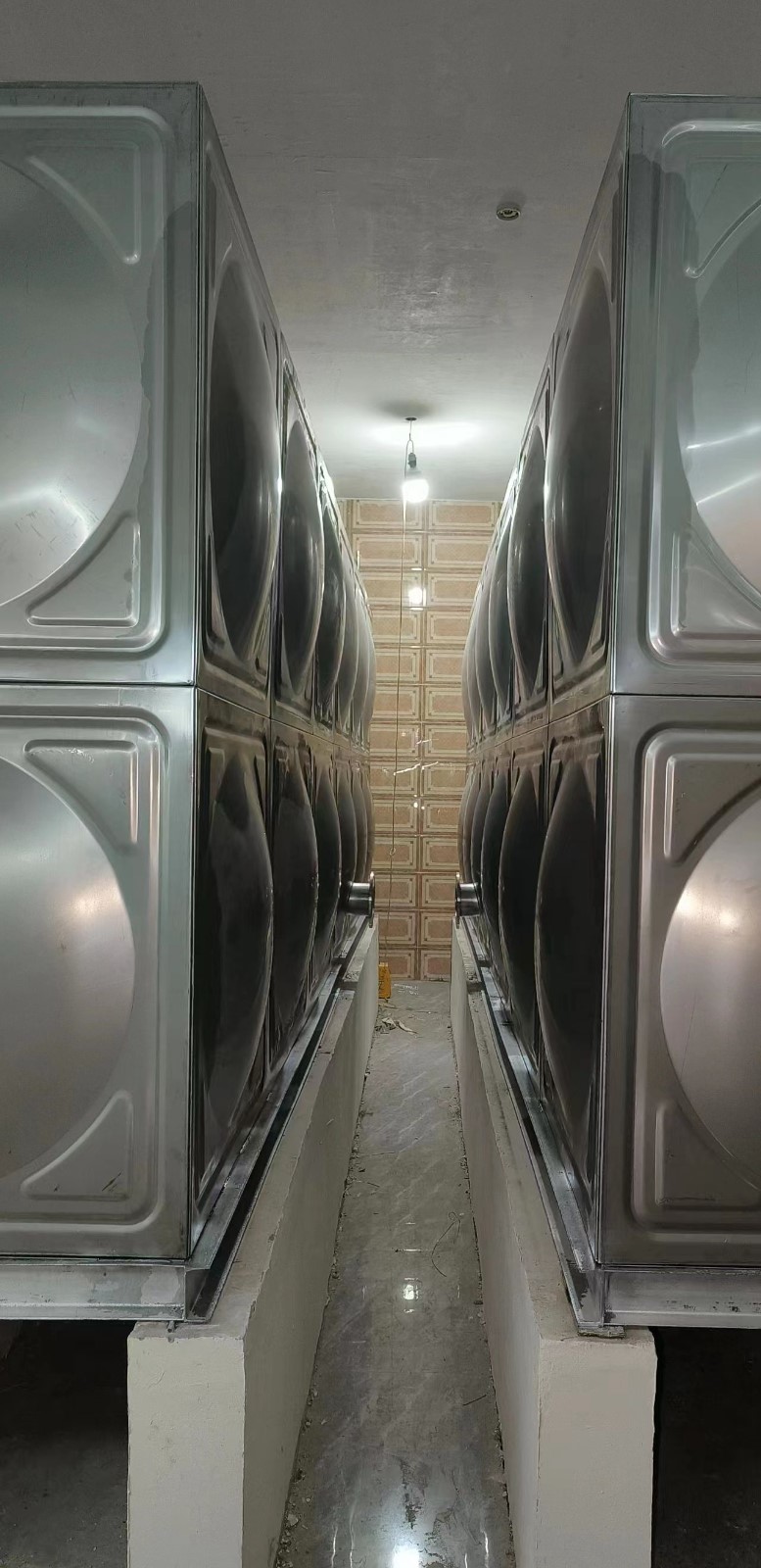 我司承接的河北省唐山市玉田縣潤城府地下室不銹鋼生活水箱項目,已安裝試水完畢。不銹鋼焊接水箱,是指容器本體用不銹鋼板沖壓帶一定凹凸形狀,使之鋼度大大提高,再焊接成薄殼箱體的新型水箱,是目前國內較先進、較美觀、較適用的水箱,其結構精巧、合理、先進,用材省,可在民用及工業建筑中廣泛采用,是儲存、調節用水的理想設備。